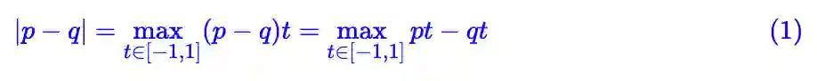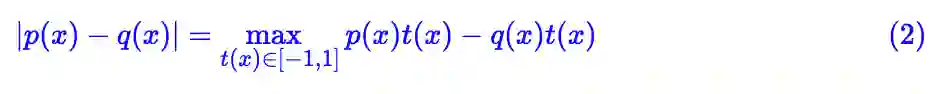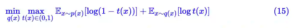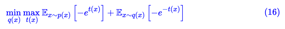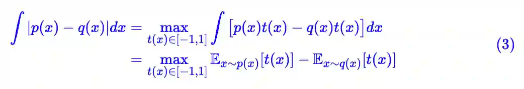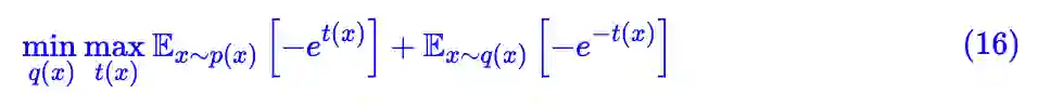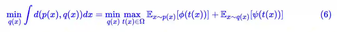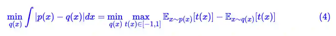 这里的 ∫|p(x)−q(x)|dx 就称为两个概率分布的 Total Variation,所以我们就通过这样的过程导出了 Total Variation 的对偶形式。如果固定 p(x),让 q(x) 逼近 p (x),那么就可以最小化 Total Variation,即: