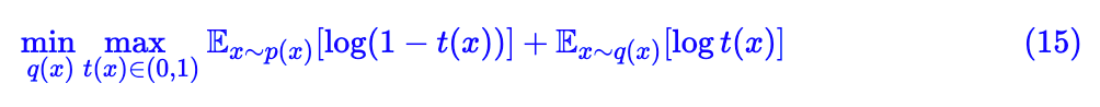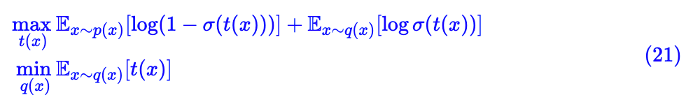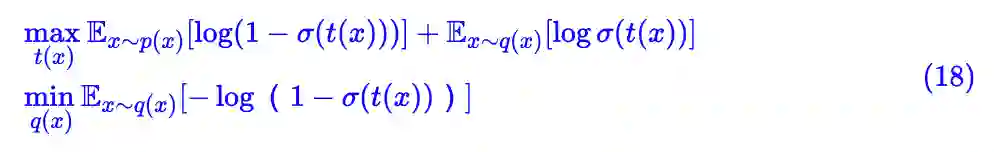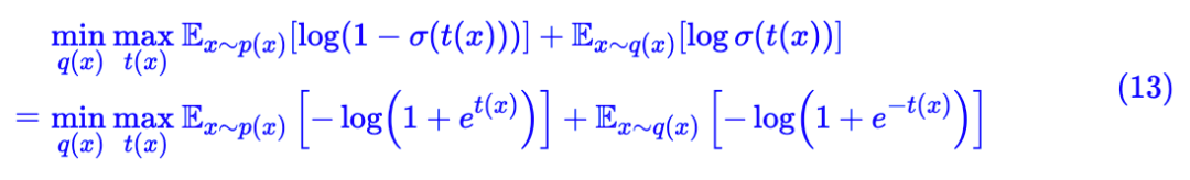 这跟原始 GAN 是等价的,只不过没有显式写出使得 t(x)∈(0,1) 的激活函数。