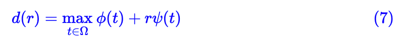 这时候 ϕ(t)+rψ(t) 就存在唯一的极大值点 t=ω(r),并且它也是最大值点,对于目标 2 来说这已经完成了一半的内容。现在来考察当 t=ω(r) 时,d(r)=ϕ(ω(r))+rψ(ω(r)) 是否如我们所愿满足剩下的性质(即 d(r) 的最小值在 r=1 时取到)。