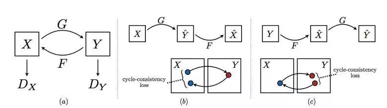 CycleGAN的思路是训练两对生成器-鉴别器来把图像从一个领域转变到另一个领域再转变回来,这样的话需要保证周期一致性——在一系列的转变之后,要得到与原始L1损失相近的图像。周期损失则是保证生成器转变后的图片不会与原始图片完全不相关。