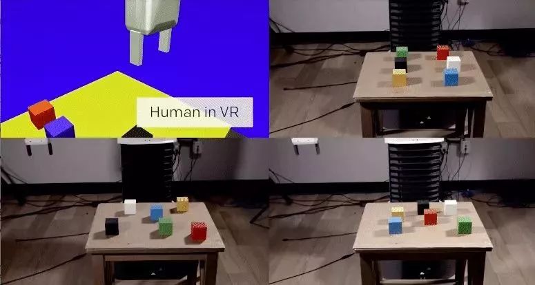 在其中一项研究中,研究小组展示了one-shot learning的可能性:一个人在虚拟现实中展示如何执行一项特定的任务,而一个演示足以让算法学会它,然后在实际情况下进行复制。