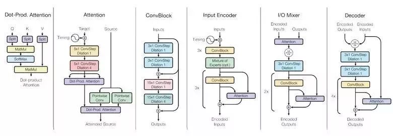 为了实现这一点他们搭建了一个复杂的网络架构,并利用不同的模块处理输入的数据和生成的结果。编码与解码的模块主要有三种类型:卷积、attention、混合专家系统。