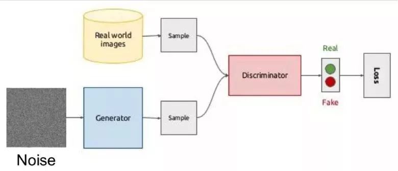 在训练过程中,生成器首先通过一个随机向量(噪音)生成图像,然后把它输入能够判别图像真假的鉴别器中。来自真实世界的图像同样会被输入到鉴别器中。
