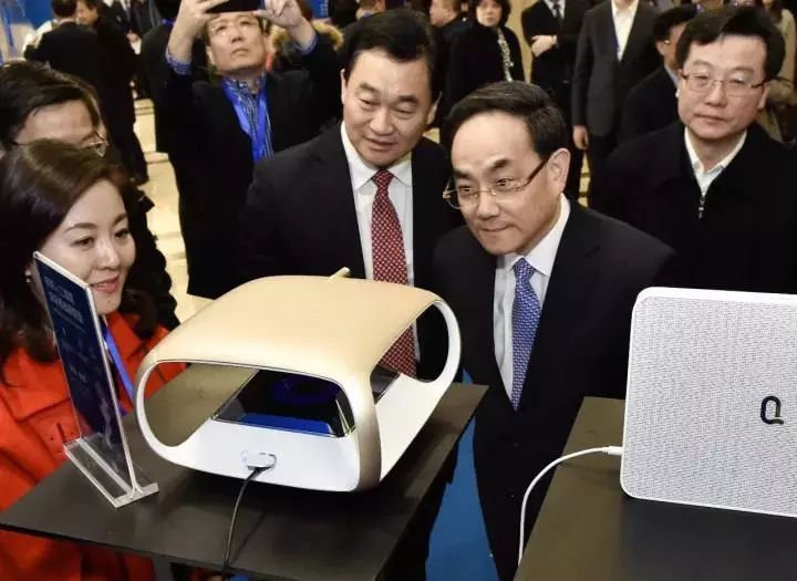 中宣部副部长、中央网信办主任徐麟,观看新华网展台上全球首个人工智能虚拟生命签约主播。
