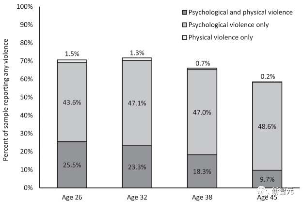 从26岁到45岁,身体暴力的下降率大于心理暴力的下降率,即25.5%到9.7%(减少15.8%),后者为69.1%到58.3%(减少10.8%)。