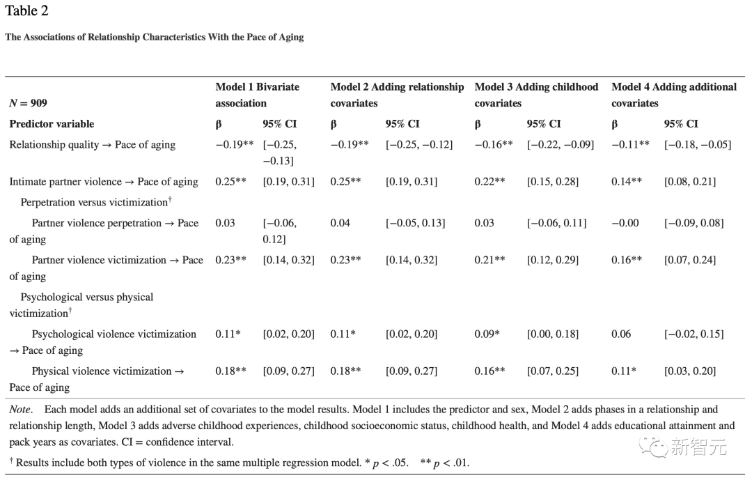 此外,与衰老最相关的是,随着时间推移一个与这些亲密关系特征的累积接触量,而不是关系质量或伴侣暴力在某一时刻的增加或减少。