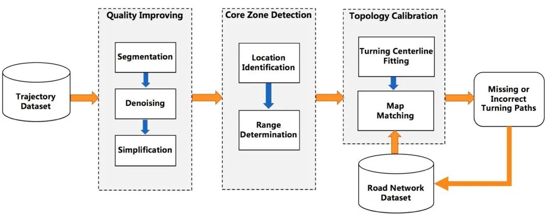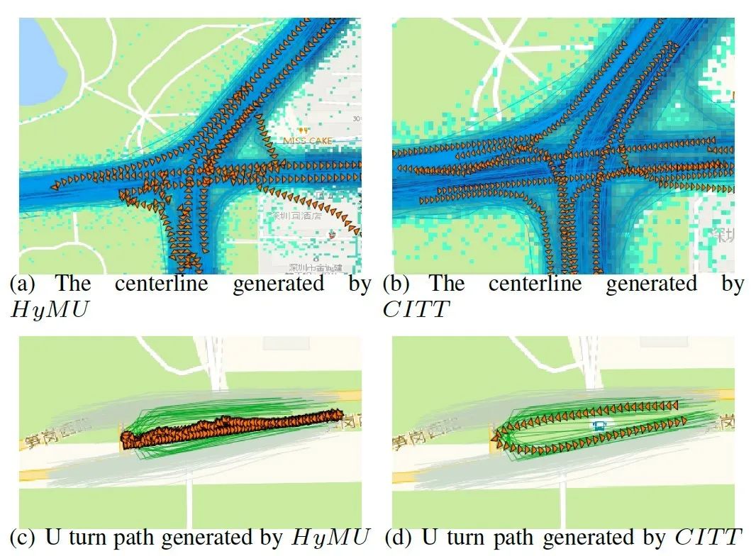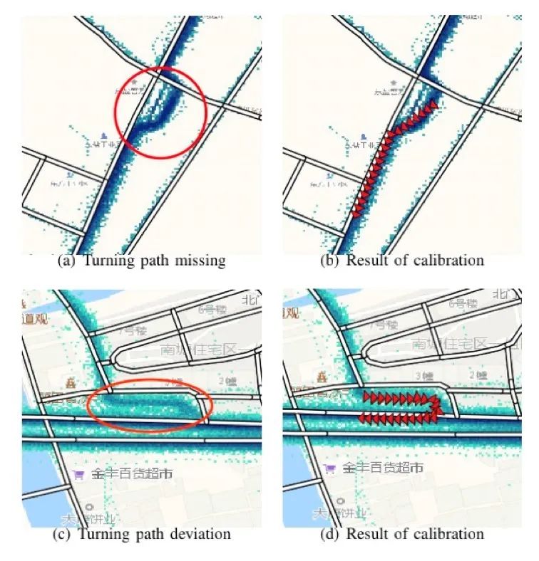 在影响区拓扑结构的校准阶段,我们基于检测的路口中心位置和核心区范围向外扩展,根据预设的半径阈值获得影响区的范围,同时获取交叉路口影响区内的全部轨迹。我们对这些轨迹进行转向簇提取与中心线拟合,并将拟合的转向路径与基准路网进行地图匹配。