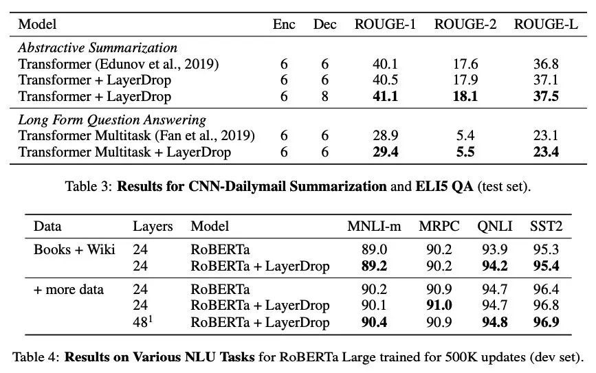 文章[4]正在投稿ICLR2020,来自Facebook AI Research,提出了类似Dropout的LayerDrop,在训练时随机mask掉一组权重,让模型适应这种“缺胳膊少腿”的情况,变得更加robust,然后在预测时直接去掉部分结构进行预测。评估的任务也非常多样,有NMT、摘要、语言模型和NLU。