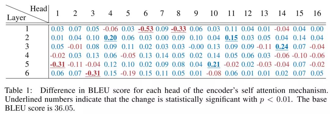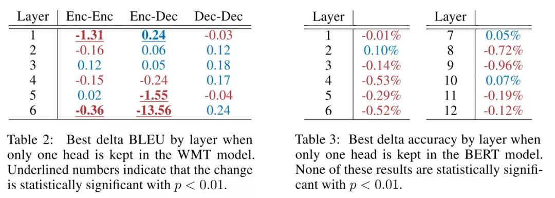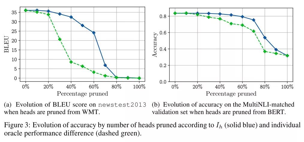 在一篇NIPS2019[3]中,作者等人主要研究了注意力头对结果的影响,评估的任务主要是encoder-decoder的NMT和BERT的MNLI。在预测阶段mask掉head进行研究后可以发现: