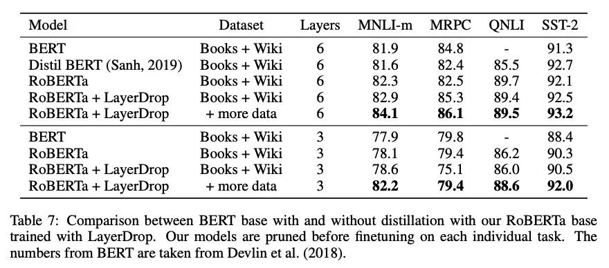另外,只将LayerDrop应用在训练过程中还有提升效果的奇效,而且能提升一定的训练速度: