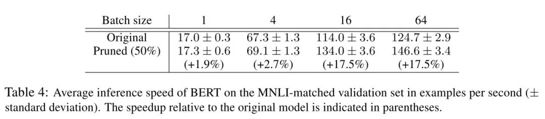 上图中,作者只保留了当前层中最好的一个head。可以看出BERT中大部分层在只有一个head的情况下,对结果的影响都不大。因此通过去掉head来压缩模型是可行的,虽然head在底层是并行计算的,在速度上可能提升不大,作者也提供了测试结果: