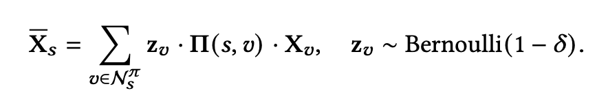 图随机神经网络是图神经网络的一致性正则化框架,优化不同增强中未标记节点的预测一致性,通过随机传播来增强数据。首先对特征矩阵进行扰动,之后通过混合顺序的矩阵在图上传播。图随机神经网络使用平均池化的矩阵来传播:
