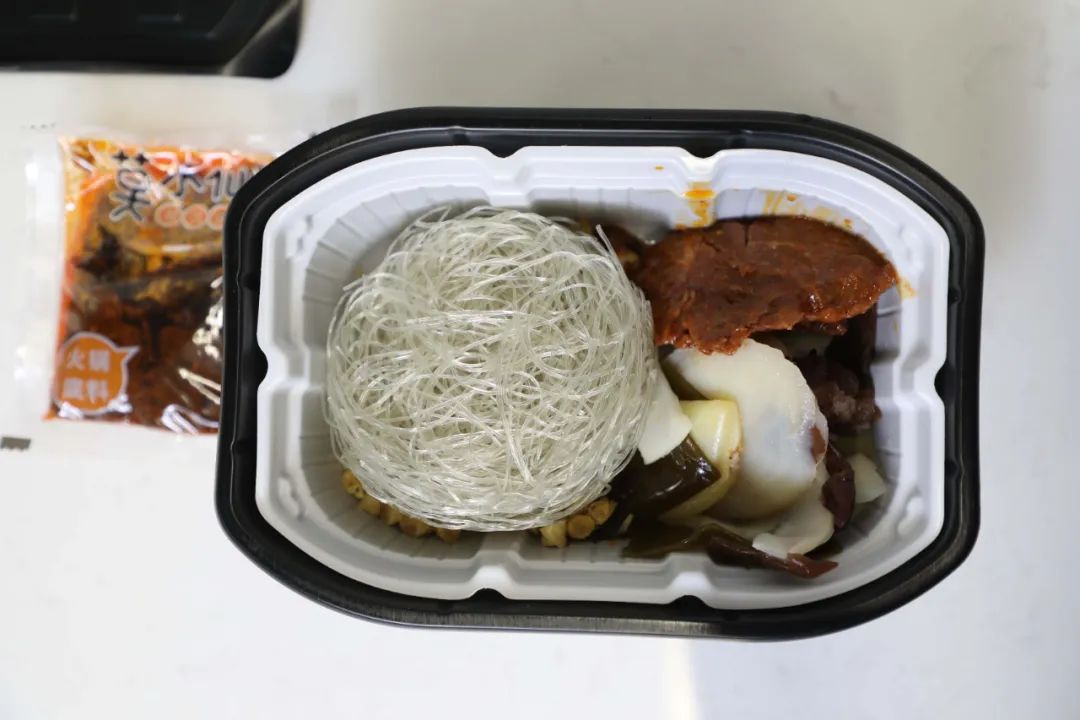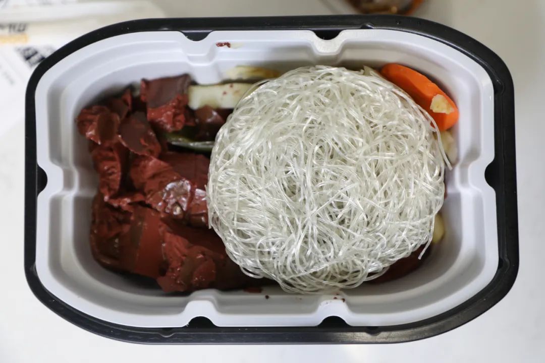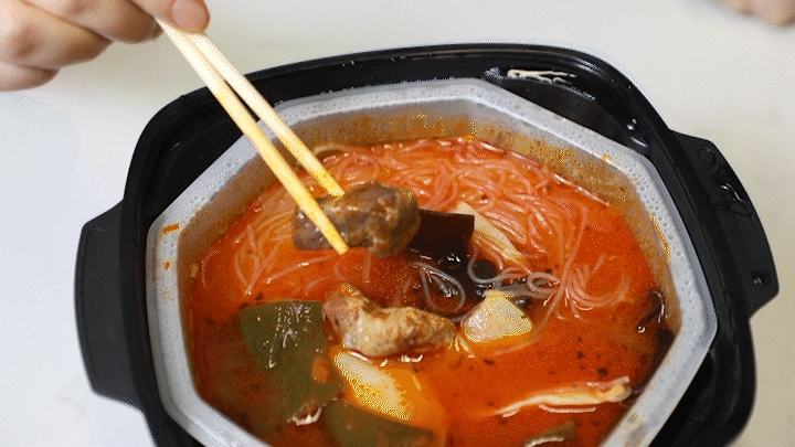 牛腩块绝对是我们这次测得自热锅里最扎实的,你看它真的是一整块的牛肉耶!粉丝爽脆,没有出现其他品牌粉丝煮久断掉的情况。