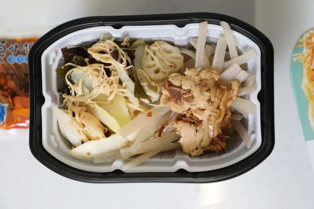 这款鸡肉锅里的素菜出奇的多,竟然还有金针菇、胡萝卜这样的隐藏款。各种食材加在一起都快从塑料碗里冒出来了,莫小仙实在人儿。