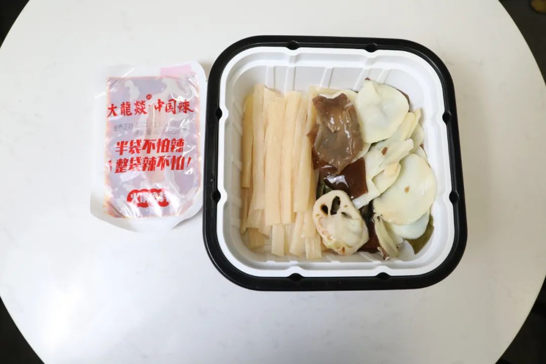 底料、粉条、肉食料包(鱼豆腐、鱼丸、鱼糕、牛肉片、撒尿牛丸)、素毛肚、蔬菜包(金针菇、杏鲍菇、胡萝卜、笋、粉丝)