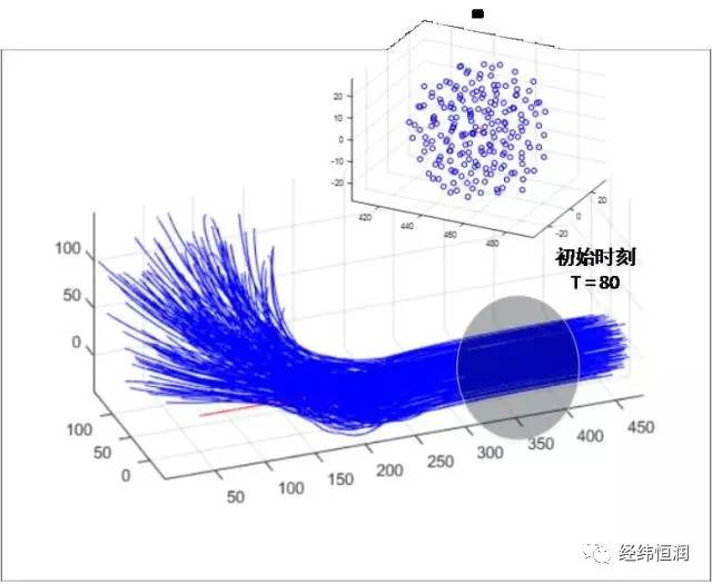 下图给出蜂群成员为50的二维平面蜂群仿真结果。图中蓝色曲线为无人机蜂群飞行轨迹,黑色透明圈是所标注时刻仿真曲线剖面,箭头所指为局部放大图,红色曲线为蜂群整体导航指令。初始时刻蜂群成员位置随机给定,随着仿真进行蜂群构型逐渐形成,经过60s后形成稳定构型并在后续的时间中保持构型。