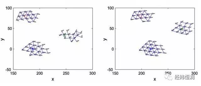 空间自由编队模式下,无人机更成员间的相对位置关系根据指定的势函数确定,稳定编队构型形成后,成员间以正三角形(二维空间编队)或正四面体(三维空间编队)为基本单元组成整体。在空间自由编队模式下,编队成员间的通信拓扑是动态变化,无人机仅对其周围一定范围内的成员具有通信能力,而无需全局通信能力,对通信系统友好,因此具有很强的适应性。