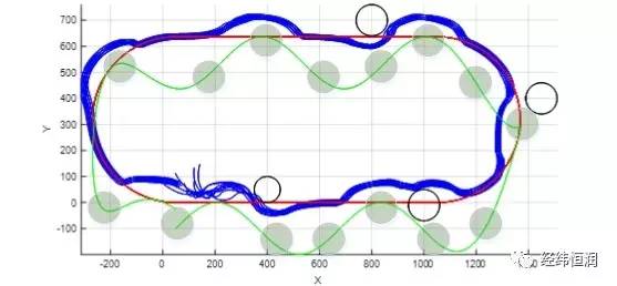 下图给出包含动态和静态障碍区域的蜂群避障仿真结果。图中蓝色曲线为蜂群飞行轨迹,黑色圆圈为静态障碍区域,红色曲线为蜂群飞行指令,绿色为动态障碍区域中心运动轨迹,绿色透明圆为某一时刻动态障碍区所在位置。由图可见,无人机蜂群在跟踪指令的过程中,能够保持蜂群构型,并成功规避动态与静态障碍物。动态仿真过程参见如下视频内容,由视频可见,在运动到航线最右侧时,由于动态障碍速度过快,当蜂群编队与其相遇时,规避动作使队形冲散,且有部分蜂群成员进入动态障碍区,该部分体现出针对不同环境条件,需要进行避障算法参数的调整,以平衡蜂群构型保持倾向和避障倾向。