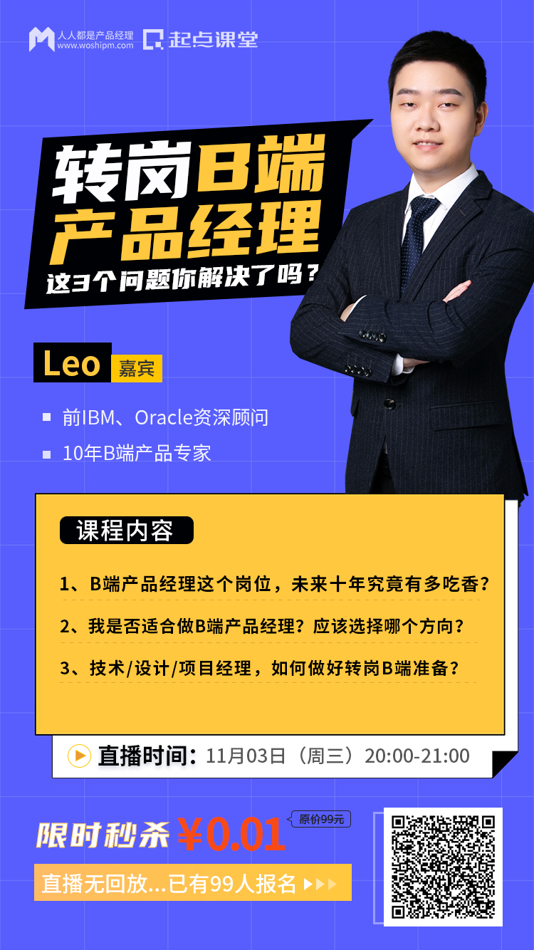 这是由起点课堂出品的B端产品公开课,专为正在做B端产品同学,或者对B端产品感兴趣想要了解相关工作内容的同学打造,课程将由前IBM、Oracle资深顾问@Leo老师直播授课。