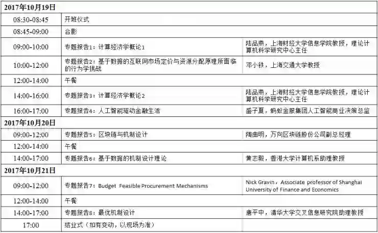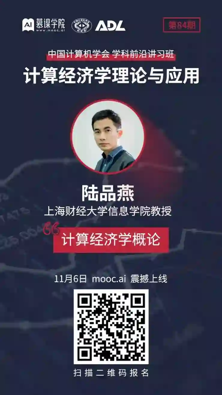 本期课程邀请了五位来自清华、上海财经大学、上海交通大学、香港大学的计算经济学领域专家以及蚂蚁金服、万向集团的负责人,从计算机经济学的基本理论、机制设计理论、具体的前沿研究课题、相关理论在区块链等领域的应用等方面,对计算经济学的原理及应用进行详尽的解读。而雷锋网将作为合作媒体,进行全程报道,无法到达现场的同学,雷锋网AI慕课学院将会呈上全程在线视频(http://www.mooc.ai/course/193)以供学习。