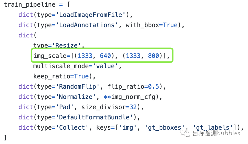 解释下这里的[(1333,640), (1333, 800)]的含义。1333表示做预处理的时候,长边不可以超过1333,那相对的,640和800就代表短边所不能超过的值。在训练阶段,长边定死不超过1333,短边会随机从[640,800]中取一个32的整数倍的数。同一张图在面对(1333,640)和(1333,800)这两种限制的时候,resize后满足条件的面积很大概率是不一样的,通过控制短边的上限,就可以达到动态控制图片大小的目的。另外MMDetection是每个batch都会去随机选取短边尺度的。