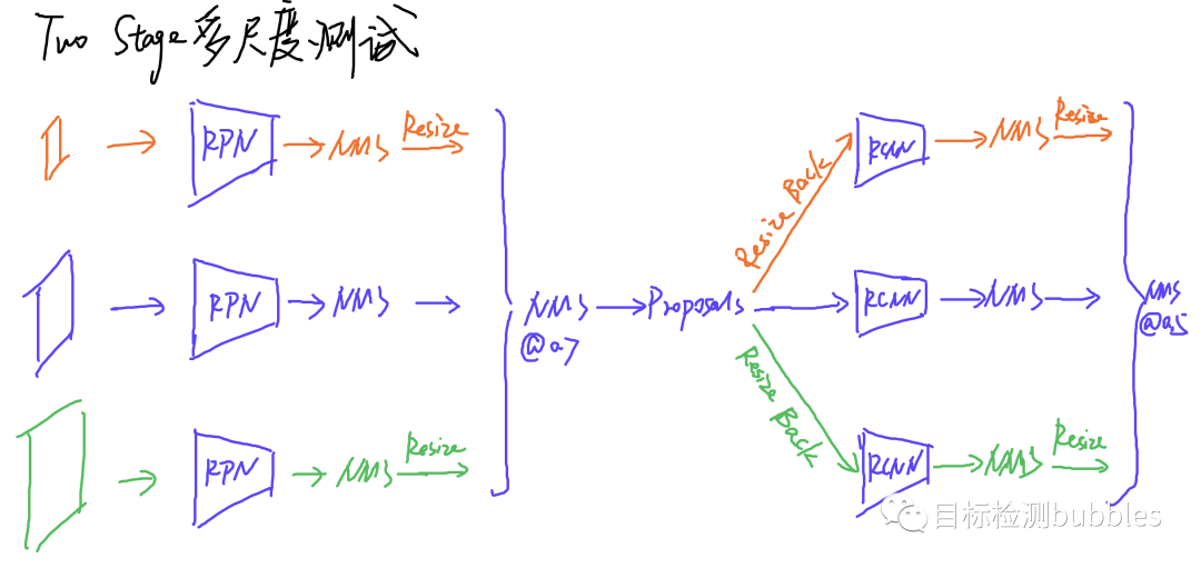 首先,不同尺度的图,通过Backbone+RPN和各自的NMS之后,会得到各自的proposals。这里对proposals的处理和one stage对结果的处理一样,要先把尺度统一到同一张图的大小上去,比如这里都统一Resize到深蓝色图的大小。然后合并到一起做阈值为0.7的NMS,得到Proposals。这时候的proposals的尺寸是相对于深蓝色图的大小,R-CNN阶段我们依然希望用多尺度,所以需要把proposals分别resize到橙色和绿色的图的尺寸上去,然后各自过R-CNN。后面的步骤与RPN和one stage是一样的,先各自做NMS,然后Resize到统一尺寸后再合并做阈值为0.5的NMS。