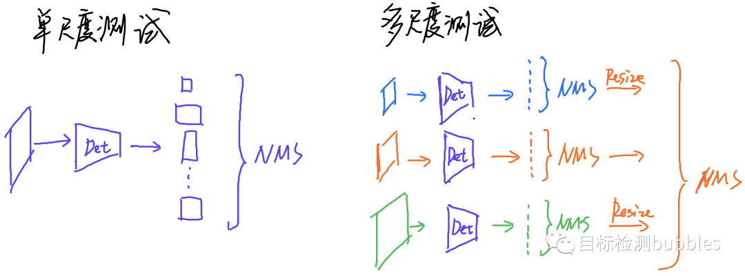 Step2. 把所有尺度归一化到同一个尺度,如图,蓝色预测和绿色预测的框都是在不同大小的图片下出的,这样所有结果放到一起NMS是对不上的。所以,图里为了表示明白,把蓝色和绿色的预测框都按照图片相对橙色的大小比例进行缩放。