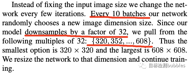 这是今天讨论的所有情况中最简单的一个。即每sample一个batch的数据喂入网络中训练时,都会先对采样出的数据resize+padding到一个随机大小。而这个大小的波动范围是实现预设好的。我们来看一下yolov2是怎么描述多尺度训练的: