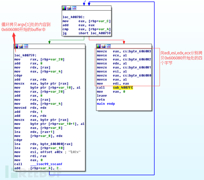 拿到一个二进制程序,首先需要分析一下它的逻辑,所以首先将sample_1二进制文件扔到IDA pro中,分析它的逻辑。在IDA中可以看到它首先分析argc的个数是否大于1,如果小于等于1则直接退出。否则,就将argv[1]的内容拷贝到以0×606080开始的全局数组中,然后将0×606080,0×606081,0×606082,0×606083这三个地址处存放的字节存入到edi,esi,edx,ecx四个寄存器中,然后调用 sub_4007fc处定义的函数。