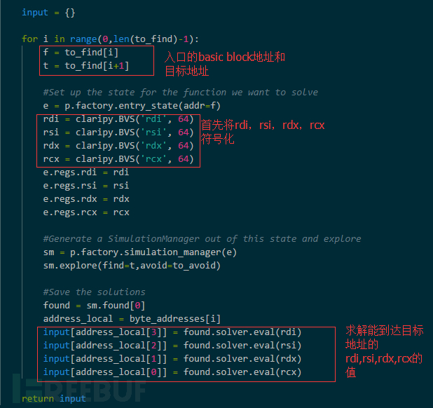 在收集了要分析的每个sub function的入口basic block,目的basic block和avoid basic block之后,就可以使用angr的动态符号执行分析工具来求解满足每个sub function的输入值(此时的输入时edi,esi,edx,ecx)。