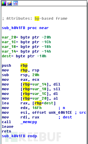 即我们可以看到它的逻辑就是对argv[1]传入的数据进行各种条件的判断,如果条件都成立则会调用最后一个sub function,最后一个sub function是将从0x6061CE处开始的数据拷贝到栈中的buffer中,可以造成buffer overflow,从而完成控制流的劫持。