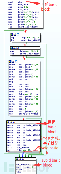 由于每个sub function的结构都是一致的:首先判断edi,esi,edx,ecx存储的数据是否满足它的各种逻辑判断,其中edi,esi,edx,ecx里面的数据是从0×606080处开始的buffer中随机选的4个字节,所以可以通过利用angr,将edi,esi,edx,ecx作为符号输入,从每个sub function的入口basic block开始,到达目的basic block处(满足各种逻辑判断),为了加快angr的求解速度,可以指定angr不需要走的路径,下图是其中的一个sub function的开始basic block,目的basic block和避免的basic block。