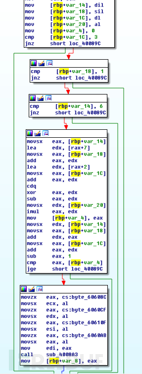 我们再来分析一下sub_4007fc处定义函数的功能,可以看到其是对edi,esi,edx,ecx进行各种判断,如果条件成立,则又从0×606080处开始的buffer中随机取出四个字节,调用下一个sub函数,下一个sub函数的功能也是类似。