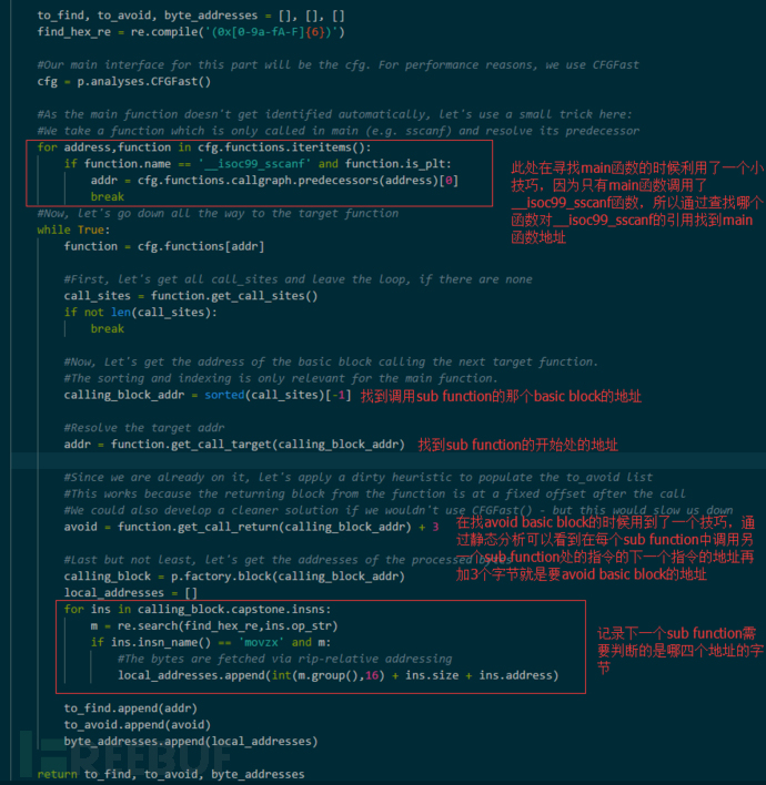 先通过angr的静态分析功能得到每个sub function所需要的分析的开始basic block,目的basic block和避免走的basic block,以及该sub function所需要判断的是从0×606080处开始的buffer中的哪四个字节。