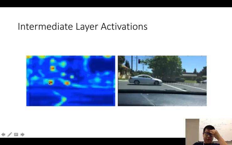 这里,为了更好地展示模型学到的特征,徐华哲从模型中抽出了 conv-4 层学到的特征。对于右侧的街道图,左侧是模型注意力的 heat-map;两图并不是完全对齐的。可以看到,行车线、红绿灯、骑车的人和汽车(表现为两个车轮)都获得了很高的注意力。