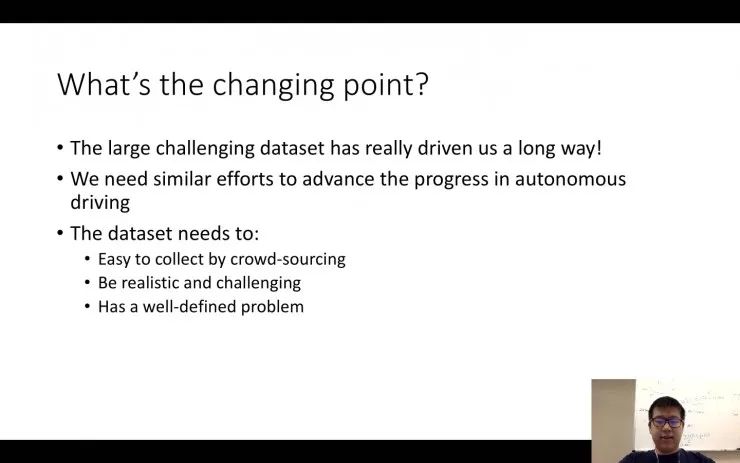 那么,许华哲认为自动驾驶领域也需要一个起到同样作用的数据集,它应当由众包得到,应当是真实的、足够难的、有一个明确的任务目标