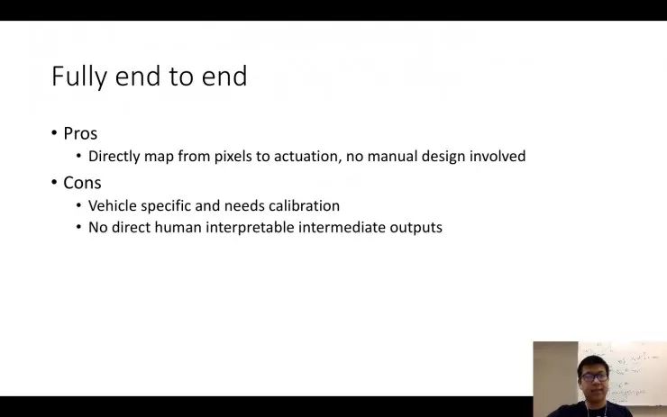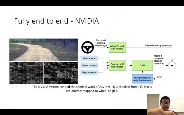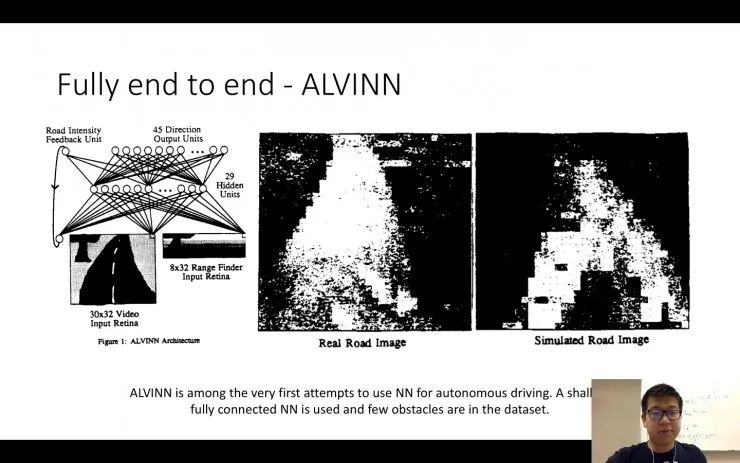 完全端到端的方法中早期的典型工作是 ALVINN,浅层神经网络的结果已经表明端到端学习有形成自动驾驶系统的潜力。