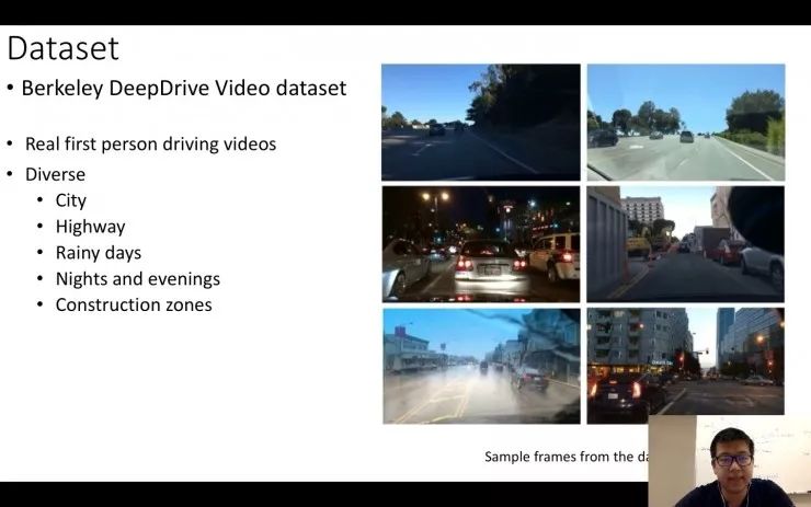 这几个数据集都不算令人满意。为了大幅度提升时长和丰富程度,许华哲他们想到了众包的方法,与 Uber 合作,采集、使用了司机视角的视频。这个数据集的特点是基于真实世界的、第一人称视角,从右侧样例里可以看到内容也非常丰富。