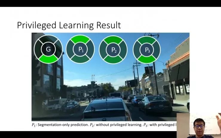 Privileged Learning 是指,模型一边预测未来的运动,一边训练一个语义分割网络,然后用语义分割网络更好地帮助模型做运动预测。P1、P2 是 Baseline,P3 是带有 Privileged Learning 之后的结果,对图中这样 “半辆车” 的情况有更好的识别能力。