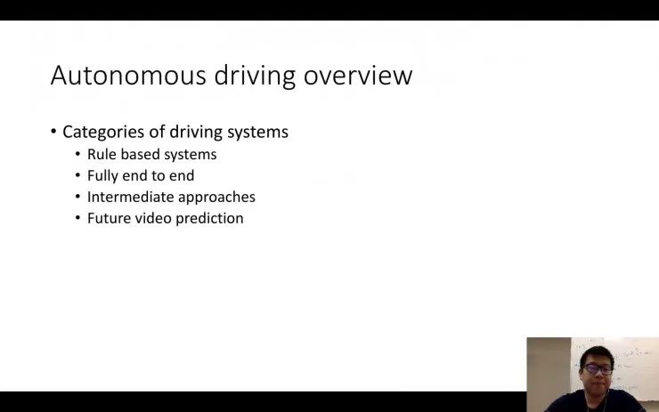 自动驾驶主要分为这样几类:基于规则的自动驾驶系统,端到端的自动驾驶系统(输出直接是对车的操作),综合性方法(Intermediate,决策系统的输入是前处理系统的输出)。最后还有一个研究方向是对未来会发生的事情做预测以便规避风险。
