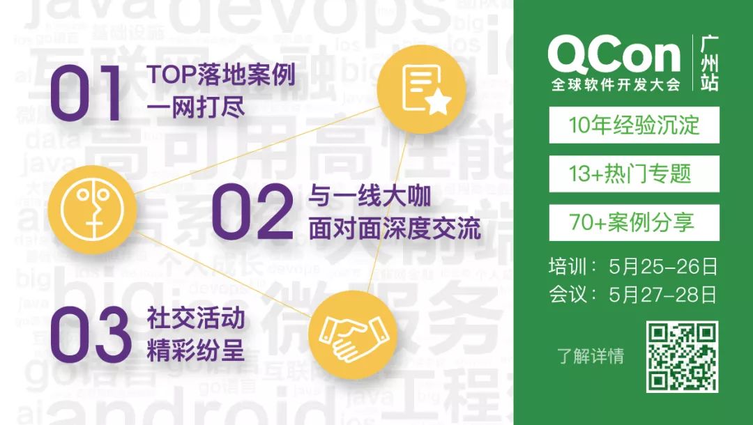 TOP 70+ 前沿技术最佳实践案例分享。5 月 25-28 日,QCon 全球软件开发大会广州站邀请来自 BAT、京东、滴滴、网易等一线大咖,共话微服务、大前端、人工智能、高可用高性能架构、DevOps......13+ 热门技术,探讨多业务场景下的技术落地与发展趋势。