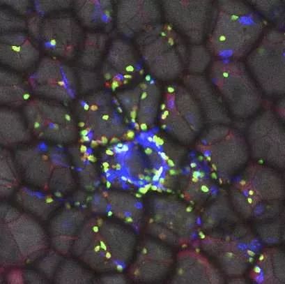 Immune cells (or gd T cells) swarm around fat cells (adipocytes) in fat tissue to regulate their lipid burning vs storage. Credit: Lydia Lynch, Trinity College Dublin