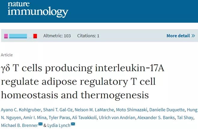 该项研究以“γδ T cells producing interleukin-17A regulate adipose regulatory T cell homeostasis and thermogenesis”为题在线发表于《Nature Immunology》期刊。