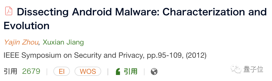 目前,根据AMiner数据显示,这项研究的引用率达到了2679,且论文相关的Android Malware Genome Project,也是安卓安全研究者最有价值的参考项目之一,惠及了全球安全产业。
