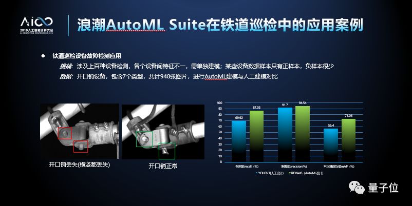比如在铁道巡检上的应用。铁道巡检是一个非常复杂的场景,在一条铁道上有上千种不同的零件,对不同的零件进行故障率检测,对于模型算法的建立来说是一个巨大的挑战。