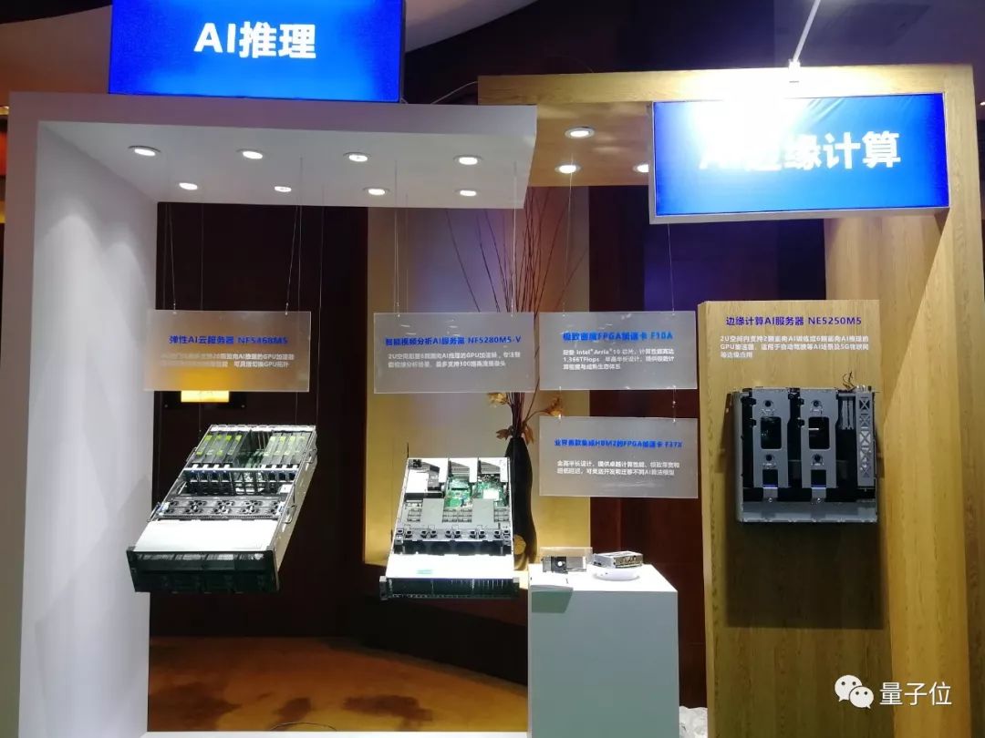 面向推理,有NF5468M5这样的弹性AI云服务器,可以在4U空间能集成20块推理加速卡,既支持英伟达的P4/T4,也支持寒武纪的ML100、ML270和众多FPGA加速卡。