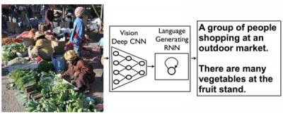而Google将以上过程中的第一种RNN用深度卷积神经网络CNN替代,这种网络可以用来识别图像中的物体。通过这种方法可以实现将图像中的对象转换成语句,对图像场景进行描述。概念虽然简单,但实现起来十分复杂,科学家表示目前实验产生的语句合理性不错,但距离完美仍有差距,这项研究目前仅处于早期阶段。图6展示了通过此方法识别图像对象并产生描述的过程。