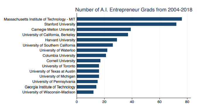 图 5. 2004 至 2008 年间毕业生获得最高学位后创办 AI 公司最多的北美大学排名。