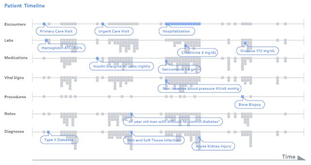 我们用时间线来展示患者电子病历中的数据。为方便说明,我们按行显示各种类型的临床数据,其中每个数据片段都用灰点表示,它们被存储在FHIR中。FHIR是一种可供任何医疗机构使用的开放式数据标准。深度学习模型通过从左往右扫描时间表,分析患者从图标开头到现在的住院信息,并据此进行不同类型的预测。