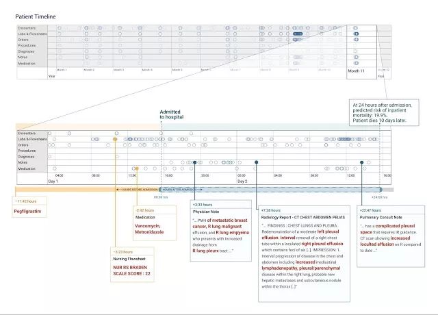 患者入院24小时后,我们使用深度学习进行预测。上图顶部的时间表包含了患者几个月时间的历史数据,我们将最近的数据做了放大显示。模型用红色标识了患者信息图表中用于“解释”其预测的信息。在这个研究案例中,模型标注了临床上有意义的信息片段。
